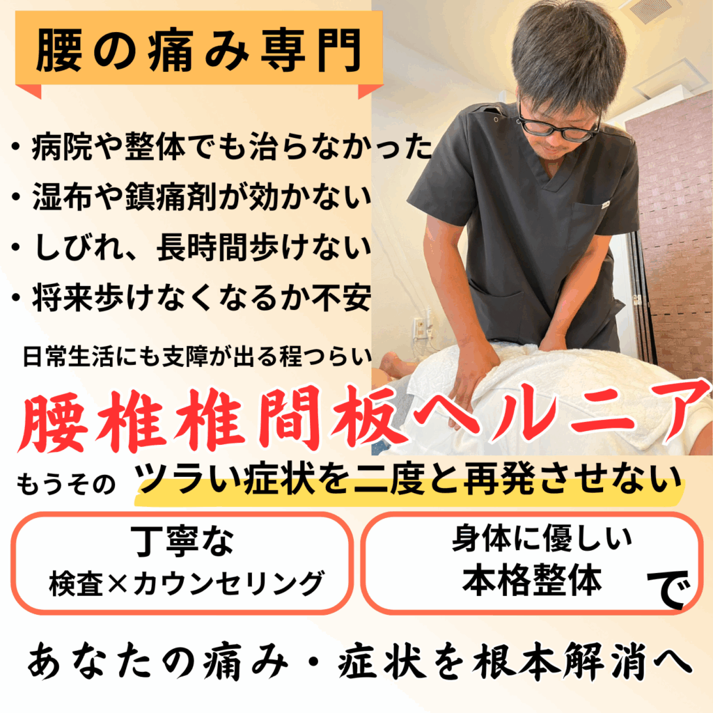 ここで大事なのが、これらの施術だけでも症状は楽になりますが、それだけでは時間の経過と共にまた同じ椎間板ヘルニアの症状が出てきてしまうという点です。当院は根本的に椎間板ヘルニアの痛みの症状を改善するだけではなく元気で痛みの出ない身体づくりを目指しています。
