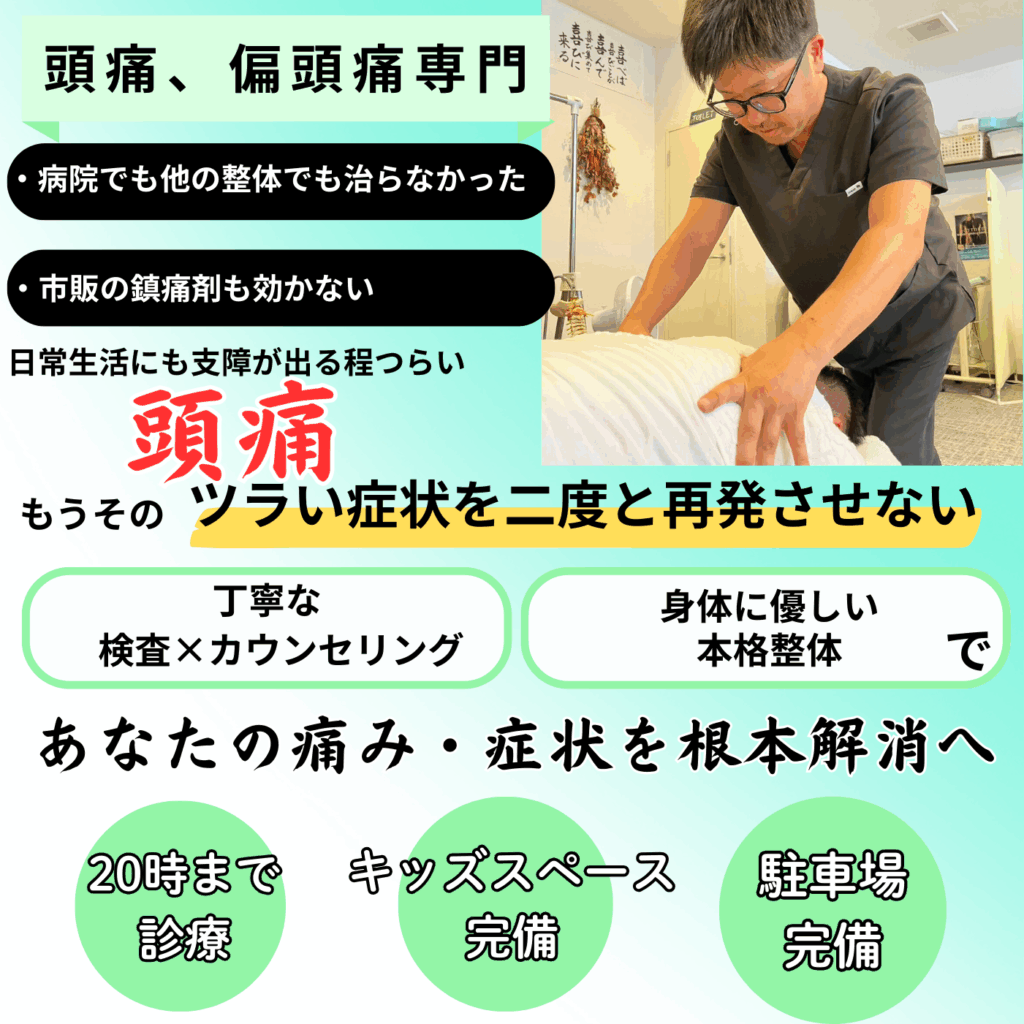 偏頭痛 脳の血管が拡張することで、その周囲の神経が刺激され炎症を起こすことで起きる頭痛が「片頭痛」です。 緊張性型頭痛 ストレスや無理な姿勢などで「頭、首、肩の筋肉」が緊張して血流が悪くなってしまいます。 その結果、 筋肉内に老廃物がたまり周囲の神経が刺激されて起こる頭痛が「緊張型頭痛」です。 頭痛は、長期的な無理な姿勢、事務作業やパソコン作業などの同じ姿勢が続くことが原因と考えられます。 それらの影響で首・肩・背中の血液の流れが悪くなり、疲労物質などが蓄積されてしまい体外に排出されなくなります。 そうすると、筋肉が固まってしまいコリや痛みの症状となり多くの方を悩ませています。 当院は頭痛のお悩みに対して、施術・改善実績が豊富な本格施術をご提供しております。 今すぐ改善したい方は是非、当院の施術を実感ください。