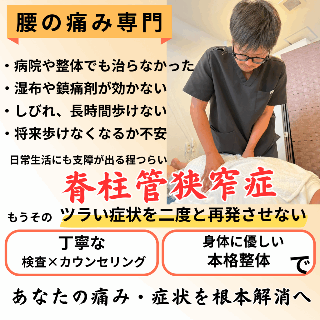 脊柱管狭窄症も骨の老化が原因なのですが、背骨の歪みや、背骨の動きが悪い事も大きな原因です。